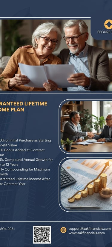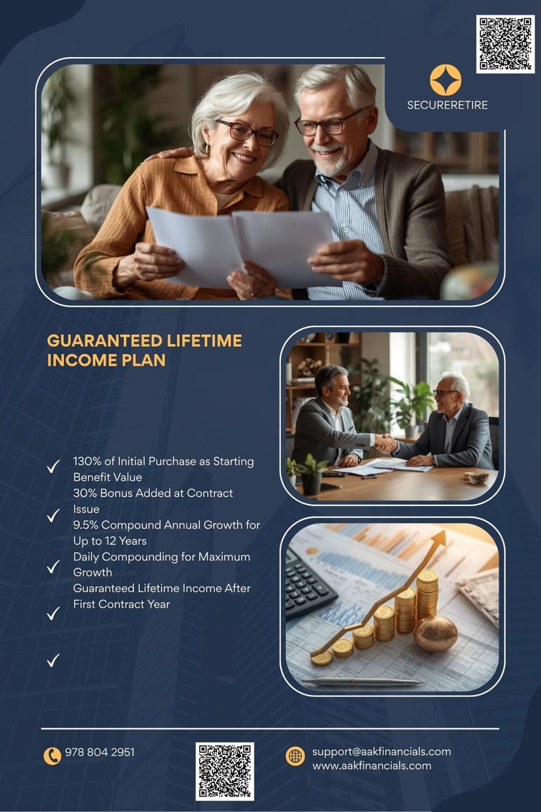 You can begin receiving lifetime income any time after the first contract year. Once started, your income payments are guaranteed for life, providing financial security and predictable income throughout retirement.